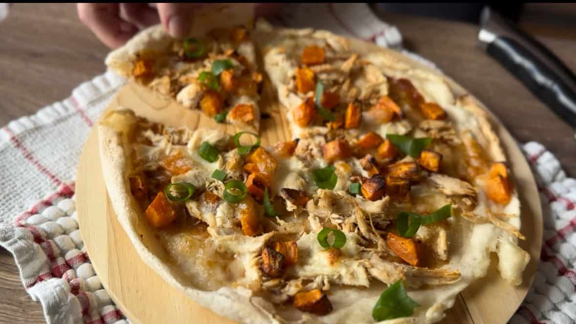 Sourdough Discard Skillet Pizza with Barbecue Chicken and Sweet Potato
