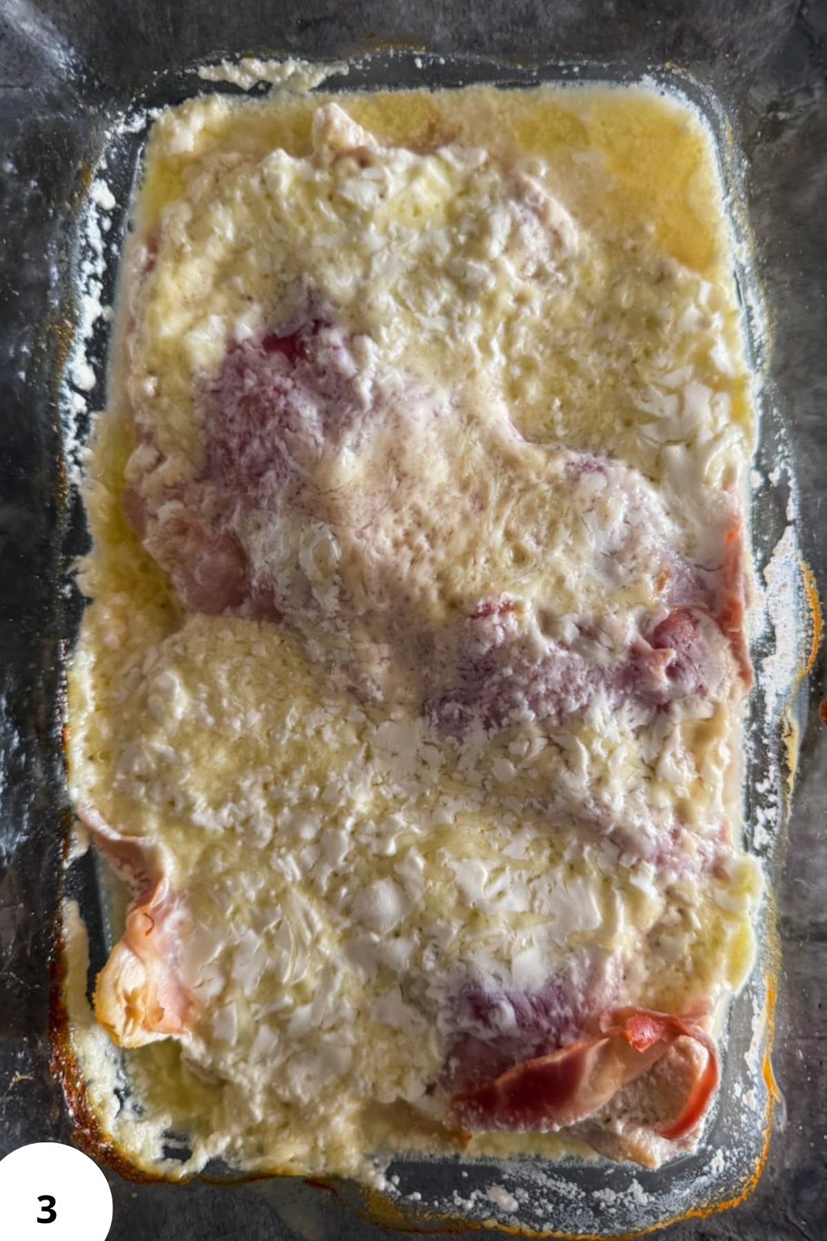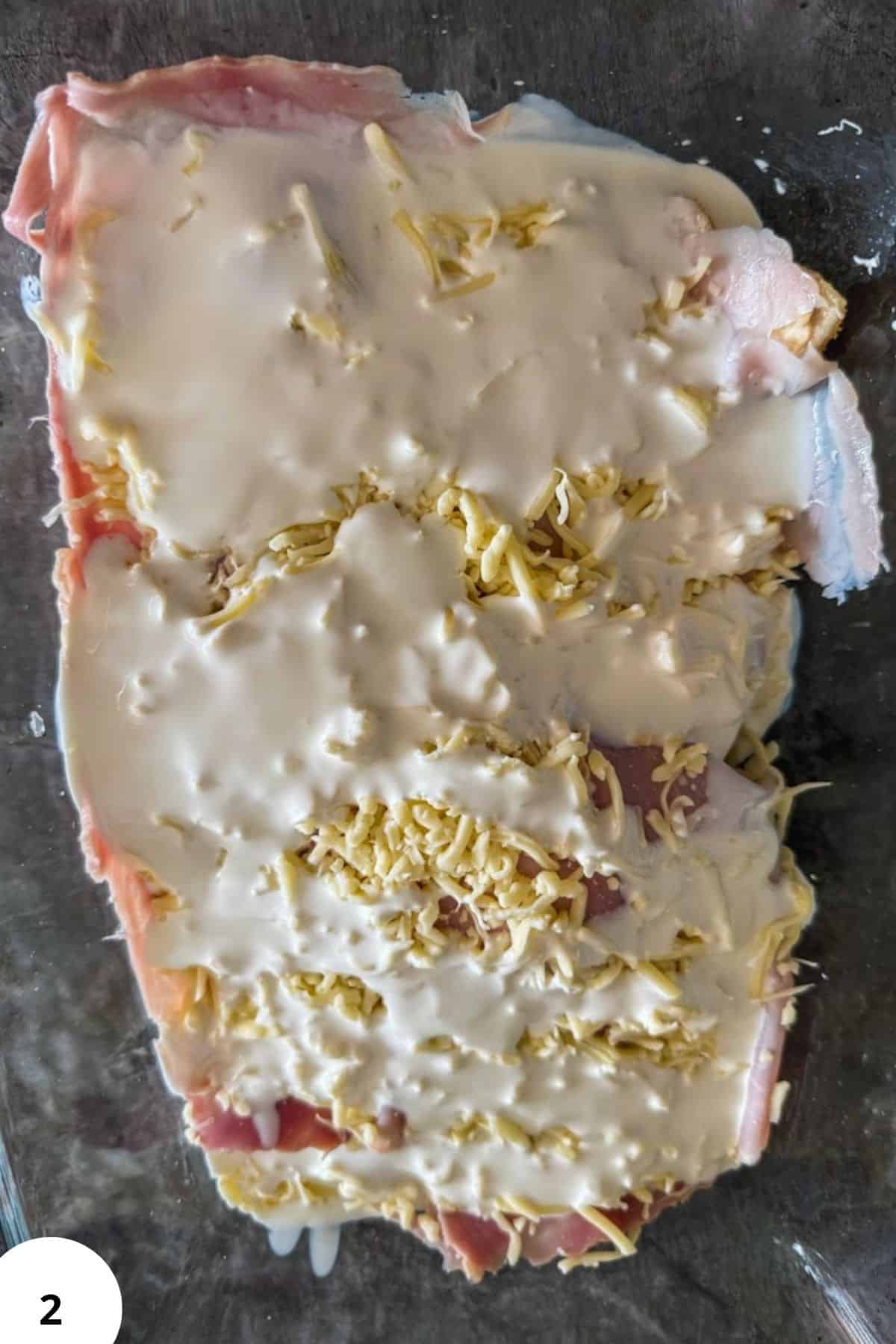 Step 2: Add a layer of cooked ham over the chicken, then top with shredded cheese (Image 2).