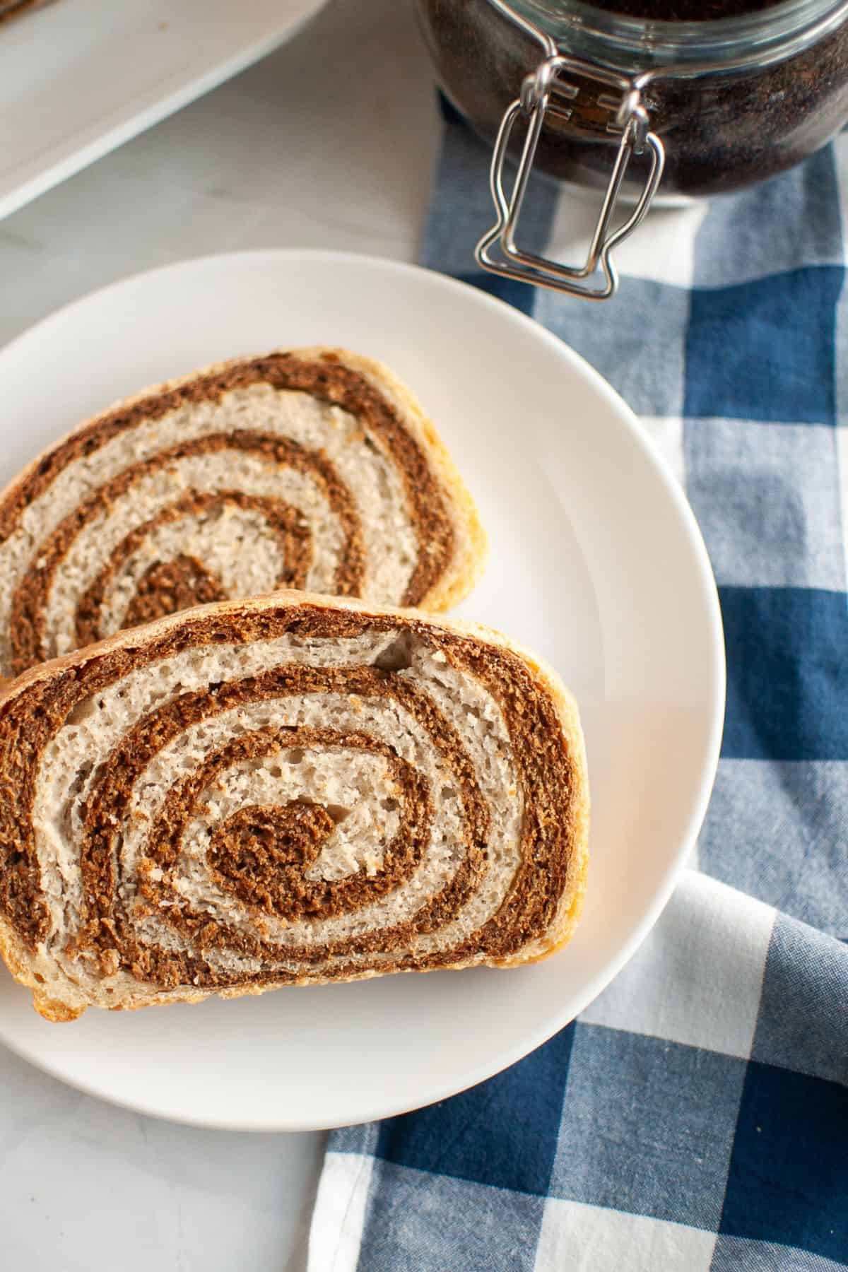 The swirl in marble rye sourdough bread is usually less defined if the dough layers did not stick together well, the dough was rolled too loosely, or the loaf was sliced while still warm. Press the layers together before rolling, roll with even tension, and let marble rye sourdough bread cool completely before slicing.