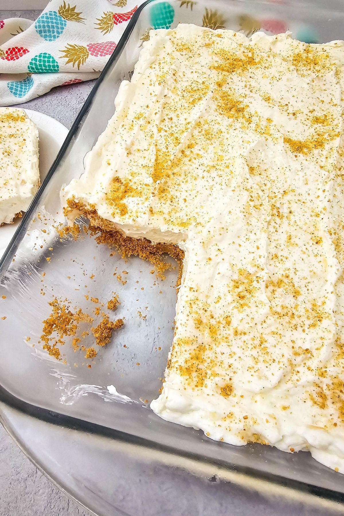 - Spread the pineapple filling evenly over the chilled graham cracker crust. Sprinkle additional graham cracker crumbs over the top if desired. Cover the pan and place it in the refrigerator for at least 4 hours, or overnight, so the dessert can set properly.
